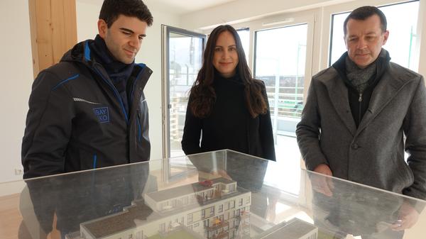 12/25 - Zeitsprung: Umbau der alten Puma an der Würzburger Straße in Herzogenaurach zu Eigentums- und Mietwohnungen durch das Bayerische Immobilienkontor. Geschäftsführer Günter Schenk (l.), Architektin Andrea Zapp und Projektleiter Balin Mohamad (r.) führten am 12. 3. 2021 kurz vor der Fertigstellung durch das Objekt. © Edith Kern-Miereisz