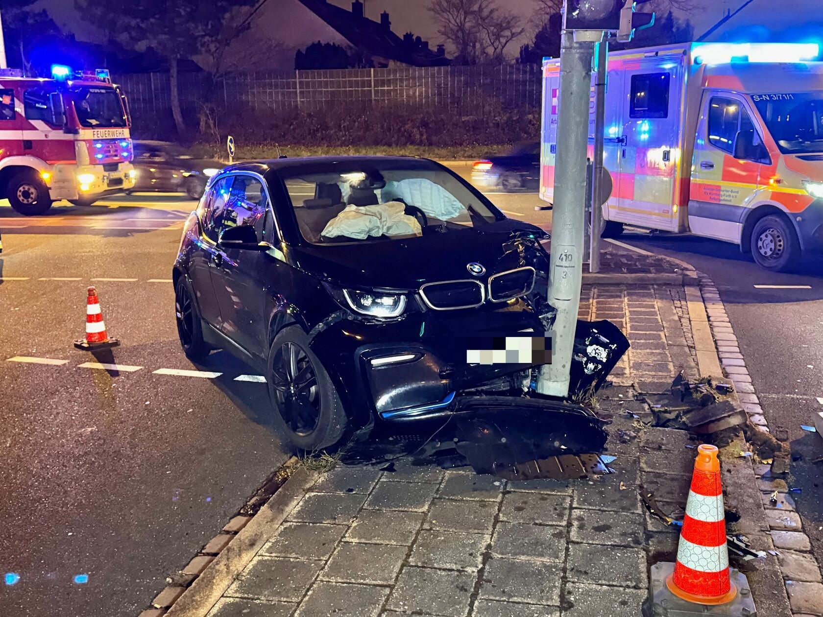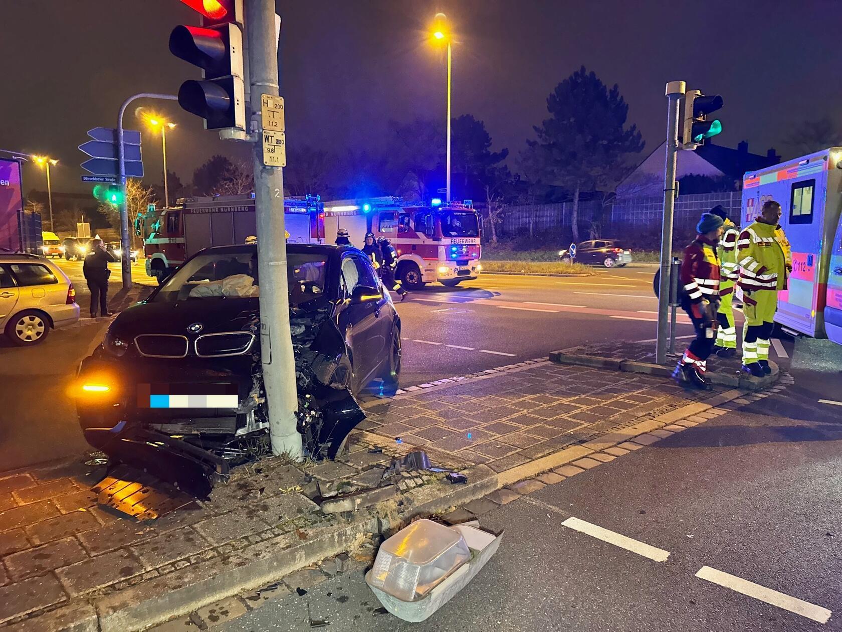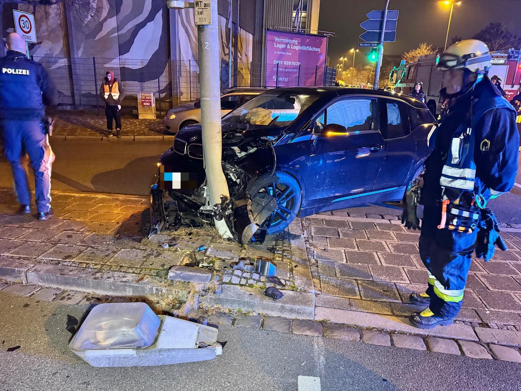 Am Donnerstagabend, 4. Dezember 2025, kam es mitten in Nürnberg zu einem heftigen Unfall. Ein E-BMW prallte derart heftig gegen einen Laternen- und Ampelmast, dass dieser gefällt werden musste.