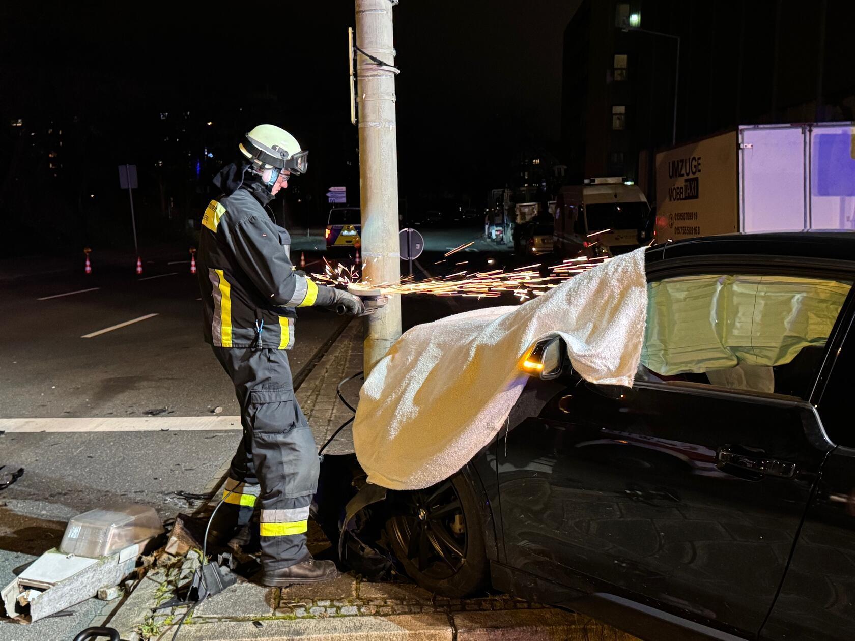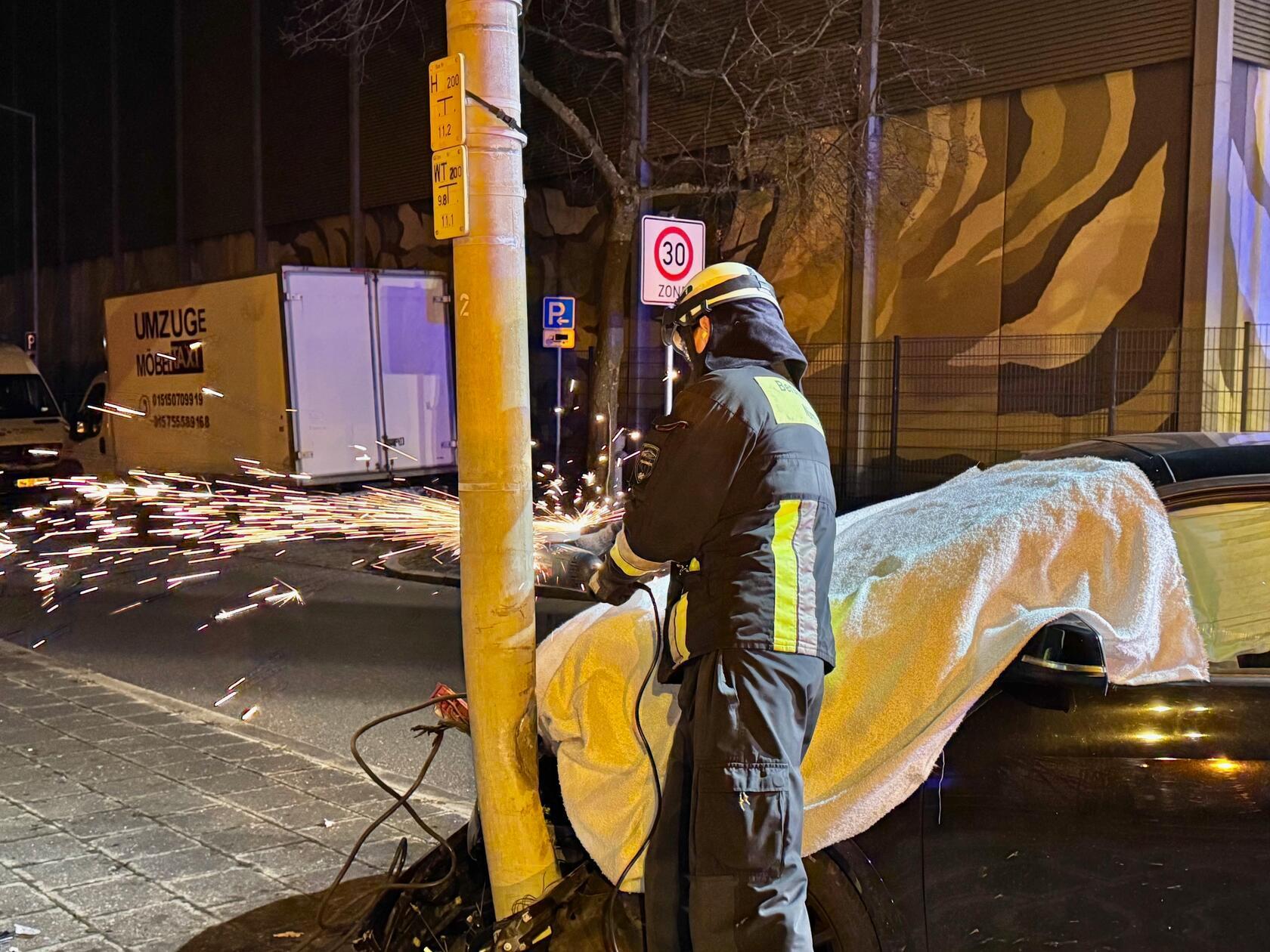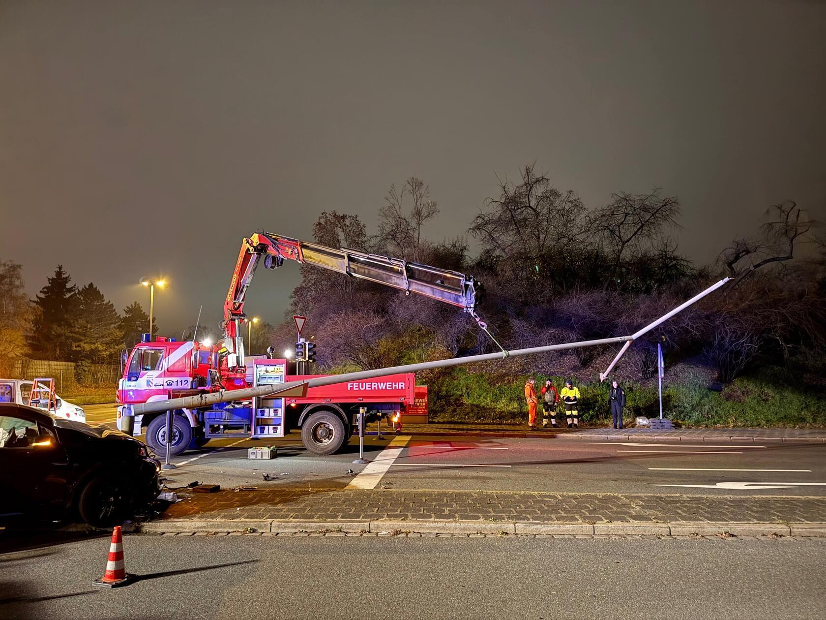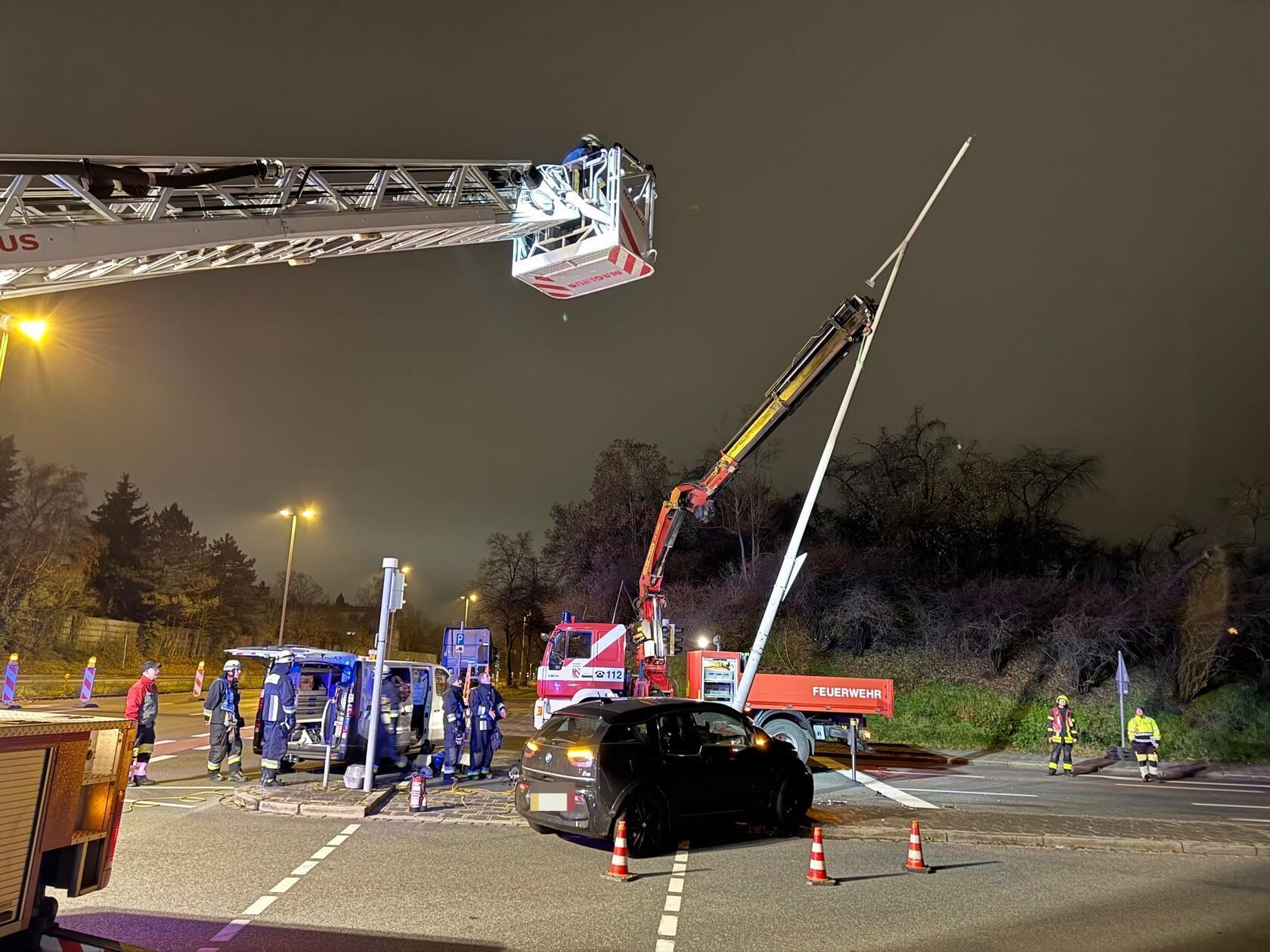Am Donnerstagabend, 4. Dezember 2025, kam es mitten in Nürnberg zu einem heftigen Unfall. Ein E-BMW prallte derart heftig gegen einen Laternen- und Ampelmast, dass dieser gefällt werden musste.