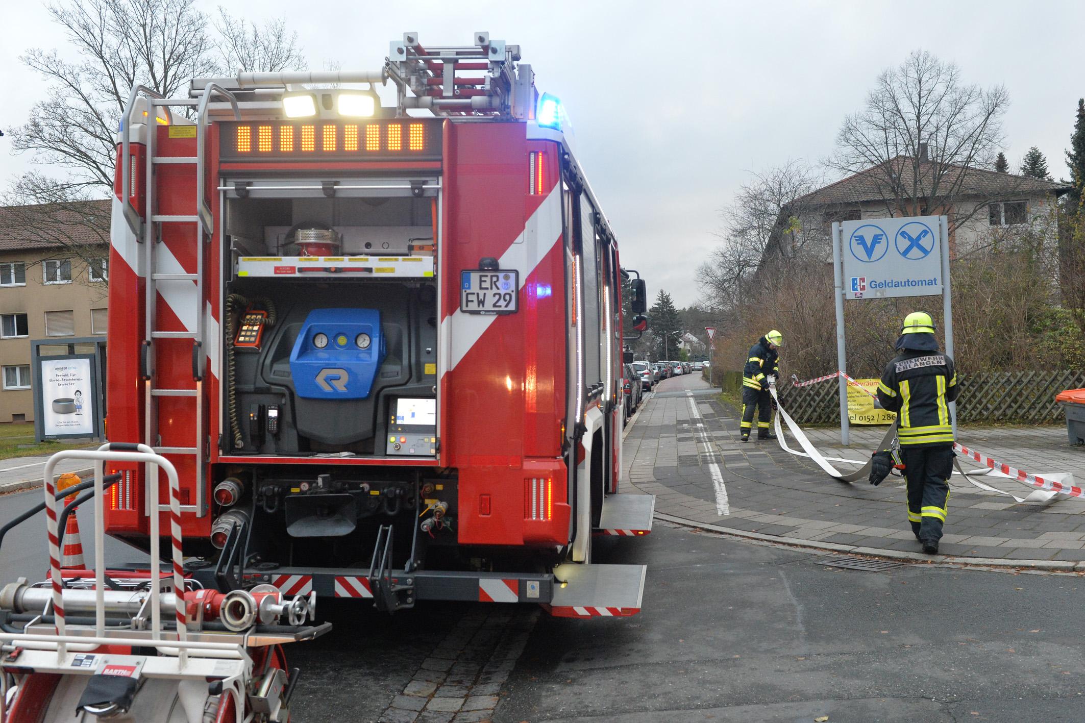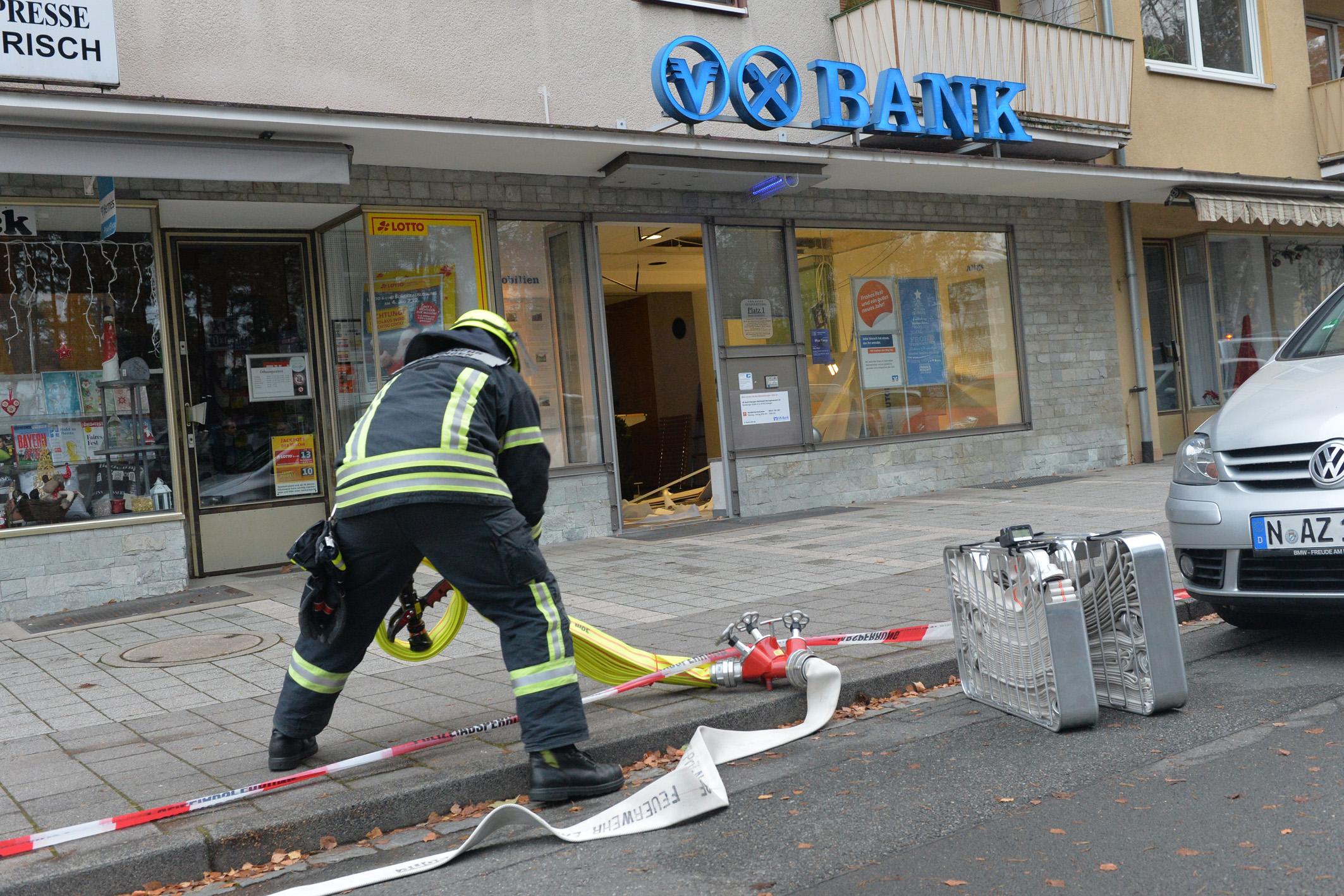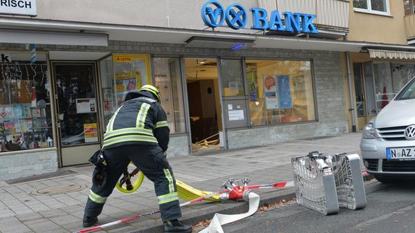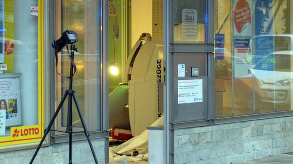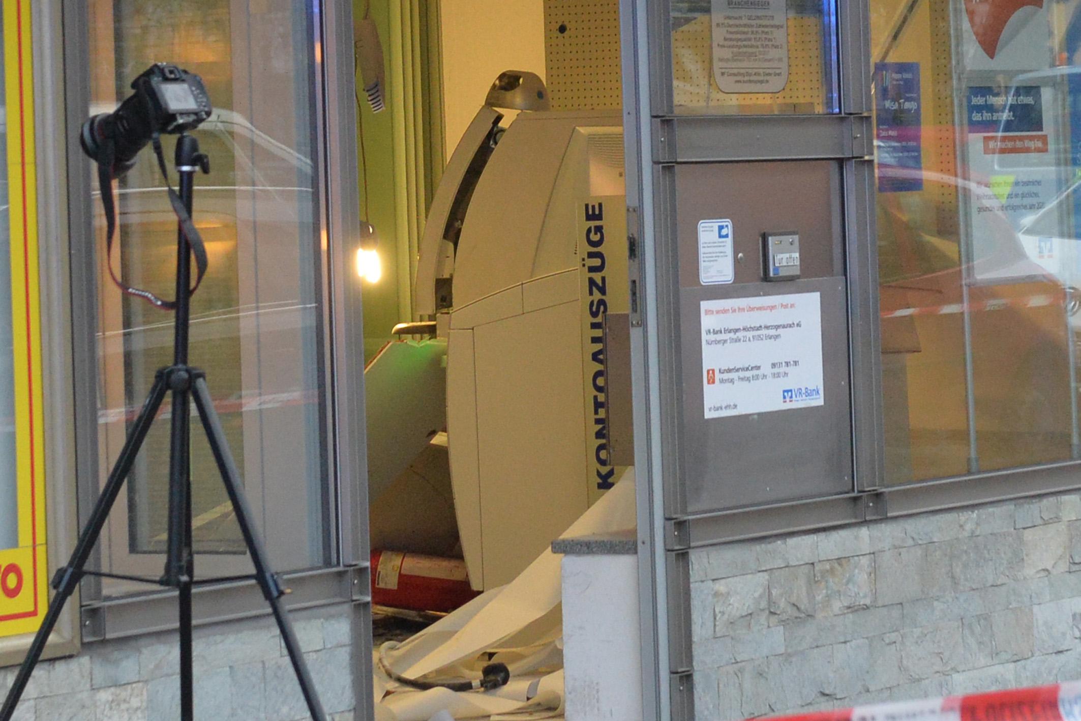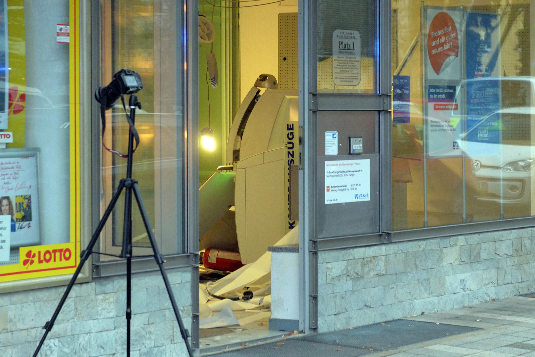 Unbekannte haben am frühen Dienstagmorgen den Geldautomaten einer Bank in Erlangen gesprengt. Sie konnten unerkannt - jedoch ohne Beute flüchten. Durch die Explosion wurde der Serviceraum der Bank komplett verwüstet. Weil nicht sicher war, ob Gas aus dem Automaten austrat, evakuierte die Polizei Anwohner benachbarter Wohnungen.